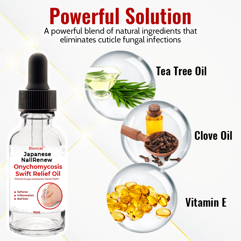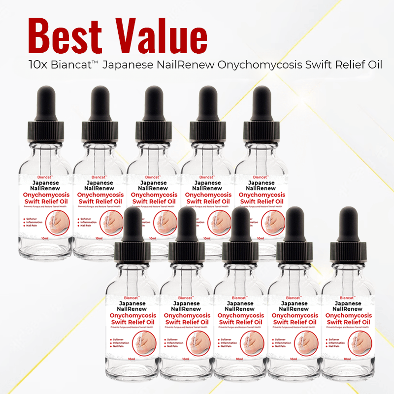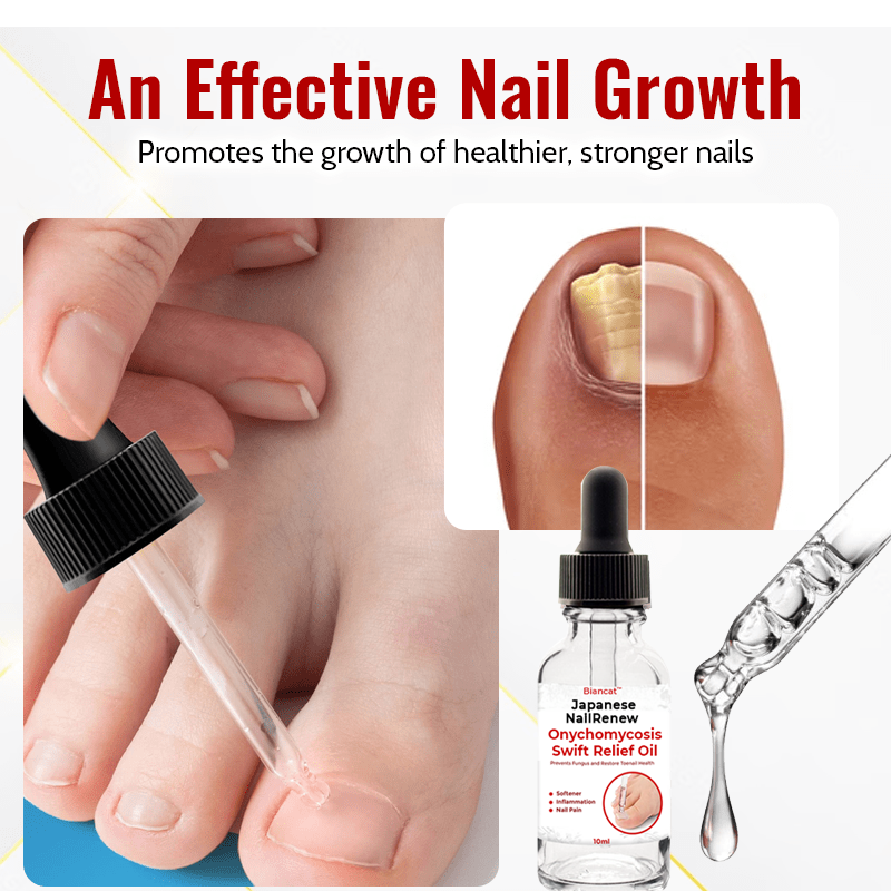 Biancat™ Japanese NailRenew Onychomycosis Swift Relief Oil is specially formulated to kill toenail fungus and treat severe fungal nail infections, preventing future recurrence and spreading of the fungus to other nails. It uproots deep-set bacteria and fungal spores with its powerful anti-inflammatory agents and bio-enzymes, reducing pain and inflammation and healing thick toenails quickly.