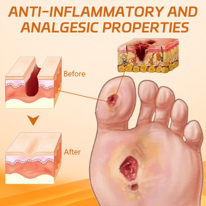 Super anti-inflammatory and analgesic, rapid relief: Ceoerty™ contains special anti-inflammatory ingredients that significantly reduce inflammation and alleviate discomfort associated with diabetic wounds. The active components in the product support the skin's natural repair mechanisms, reducing pain and promoting rapid healing. Sophora flavescens, renowned for its anti-inflammatory and antimicrobial properties, helps reduce swelling and fight infections. Fructus Cnidii has strong antibacterial effects, protecting wounds from infection.