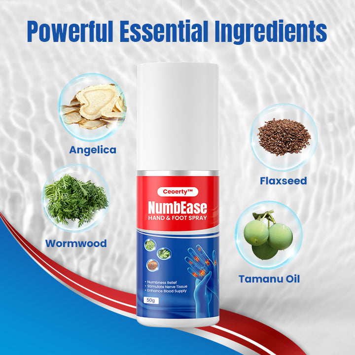 Ceoerty™ NumbEase is crafted with a unique blend of ingredients that aim to reduce the discomfort associated with numbness. By correcting an overburdened nervous system, initiating the process of blood circulation and supplying vital vitamins, this spray can offer a revitalizing sensation, improving nerve tissue compression and replenishing essential Vitamin B12. Encouraging a return to a more natural and comfortable feeling in your hands and feet - aiding in a more relaxed and increased arm & leg mobility.
