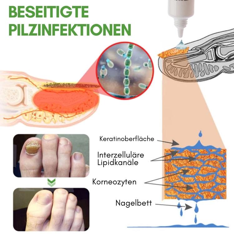 Die Tinktur unterstützt, schützt und stellt wieder ein gesundes Nagelbett her, das durch Nagelpilz oder eingewachsene Nägel geschädigt wurde. Das enthaltene Nelkenöl reduziert die Schwellung und dem daraus folgendem schmerzhaften Druck auf die Infektion, wodurch der Heilungsprozess beschleunigt wird.