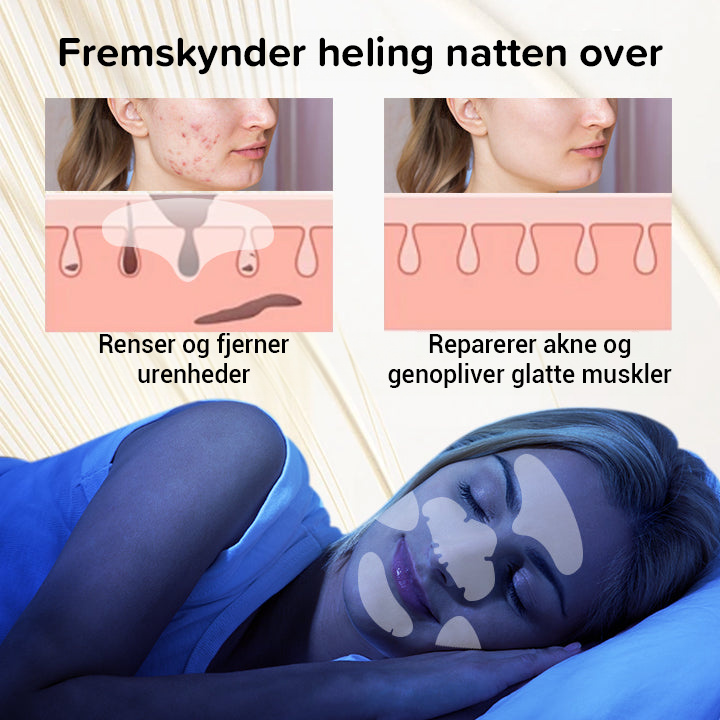 - Bremser helingen natten over: Specielt designet til brug om natten, så den passer til de gyldne timer i søvncyklussen for optimal hudgenopretning.