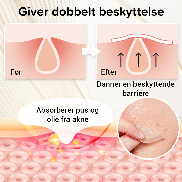 - Giver dobbelt beskyttelse: Absorberer pus og olie inde fra aknen og danner samtidig en beskyttende barriere for at forhindre ekstern kontaminering og ubevidst berøring eller klemning.