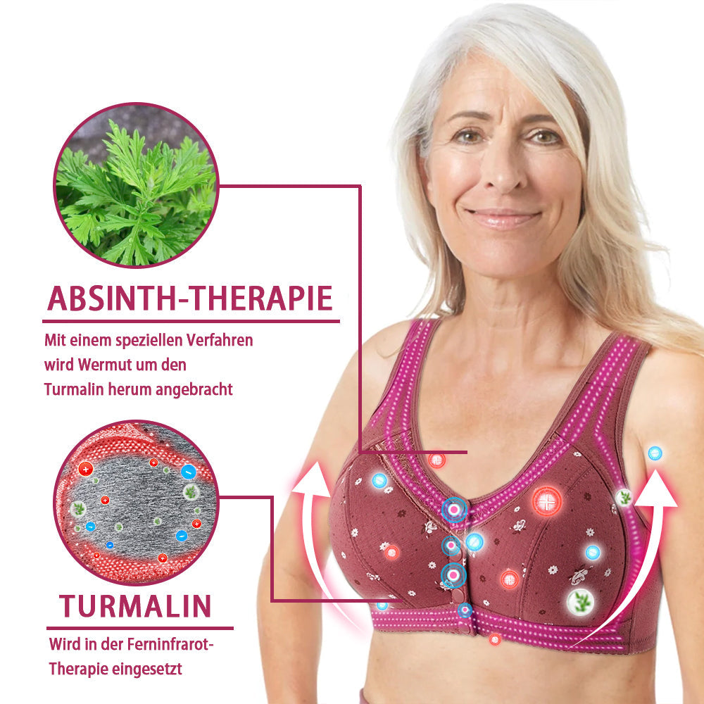 Der Ionen-Entgiftungs-BH wird in Wermutlauge getaucht und nutzt ein spezielles Verfahren, um das Turmalin zu fixieren und so Thujon und negative Ionen freizusetzen. Er kombiniert die Ferninfrarot-Therapie mit der Wermut-Liquor-Therapie und bietet Linderung von Schmerzen in verschiedenen Körperteilen, Muskelentspannung und entzündungshemmende Effekte. Langfristige Beobachtungen haben gezeigt, dass sie auch Gesundheitsproblemen wie Cellulite, geschwollenen Lymphknoten, Ödemen, Fibroadenomen und Zysten vorbeugen und sogar zur Brustkrebsprävention beitragen kann.