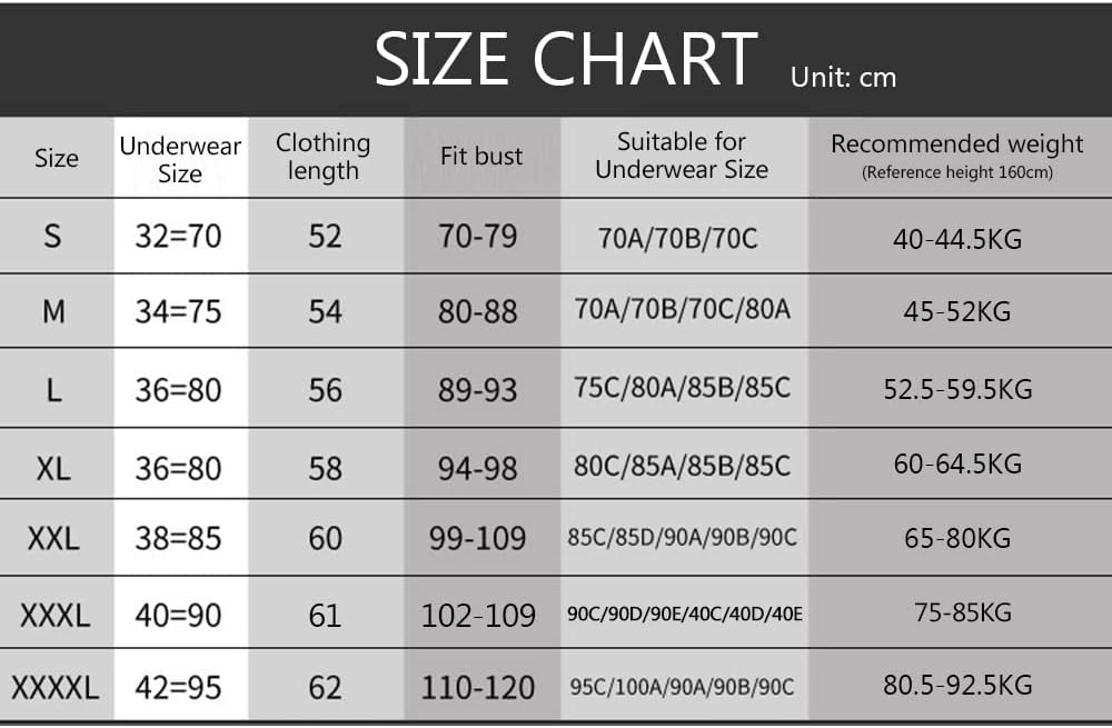 Size,Underwear Size,Clothing Length(cm):Chest Girth,Suitable for Underwear Size,Recommended Weight(kg).